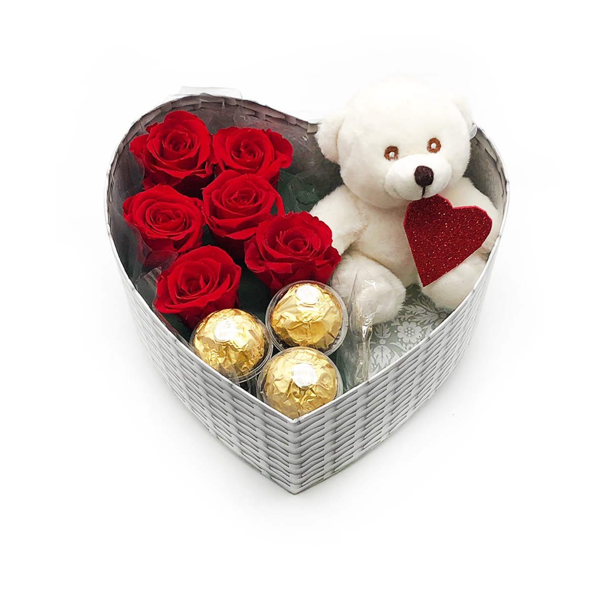 - Elección 1: Caja corazón con 6 rosas naturales, oso peluche corazón 11/12cm aprox y 3 Ferrero Rocher.